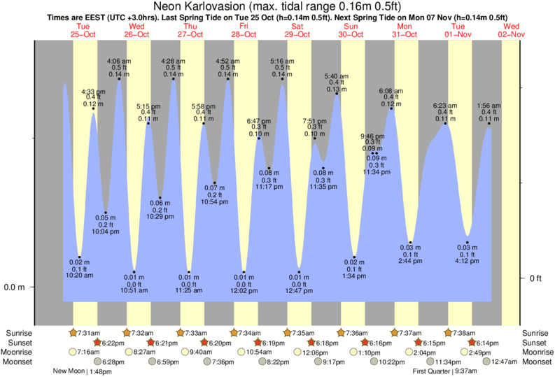 Tide Times are EET (UTC +2.0hrs). Last Spring High Tide at Neon Karlovasion was on Sat 20 Dec (height: 0.14m 0.5ft). Next high Spring Tide at Neon Karlovasion will be on Fri 26 Dec (height: 0.12m 0.4ft).