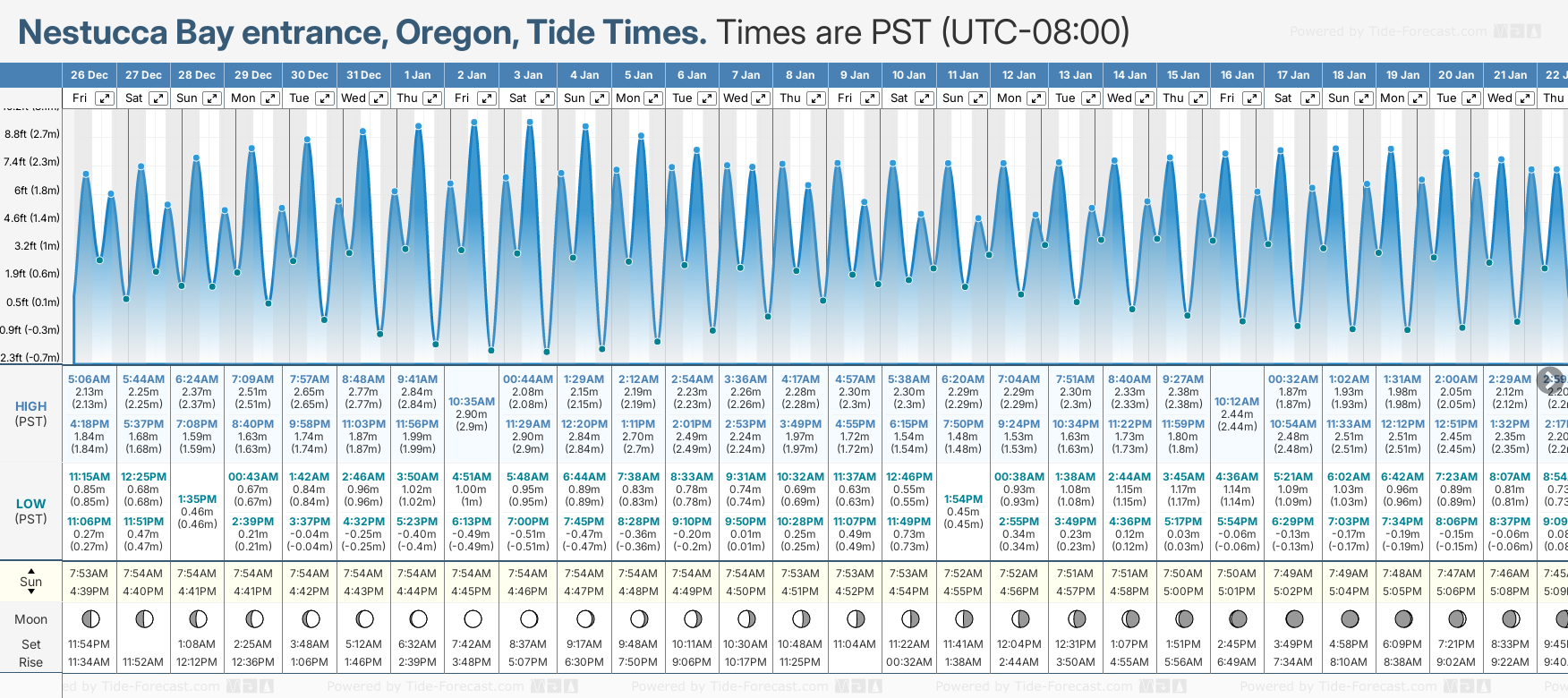 December and January Tide charts for Nestucca Bay entrance: The tide charts below show the height, time and date of high and low tides for the next 30 days.