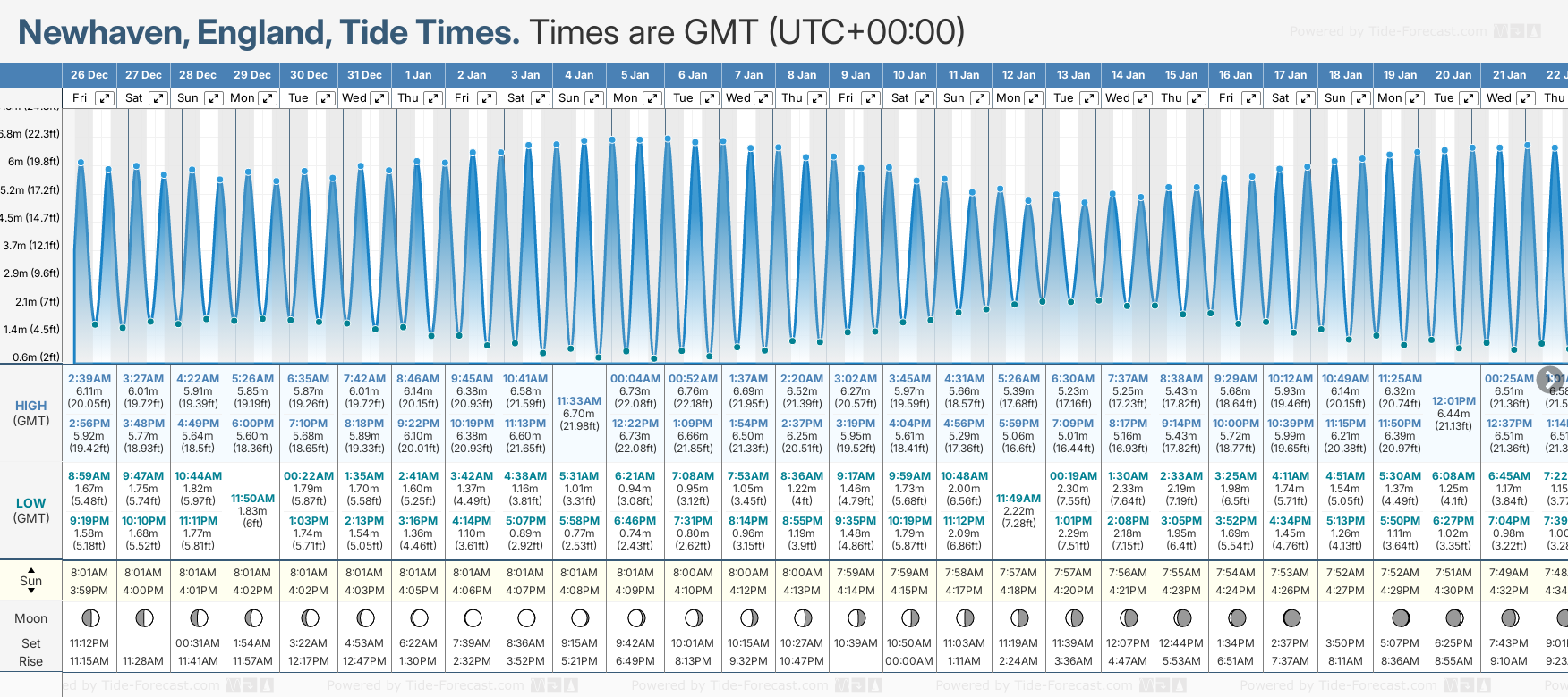 December and January Tide charts for Newhaven: The tide charts below show the height, time and date of high and low tides for the next 30 days.