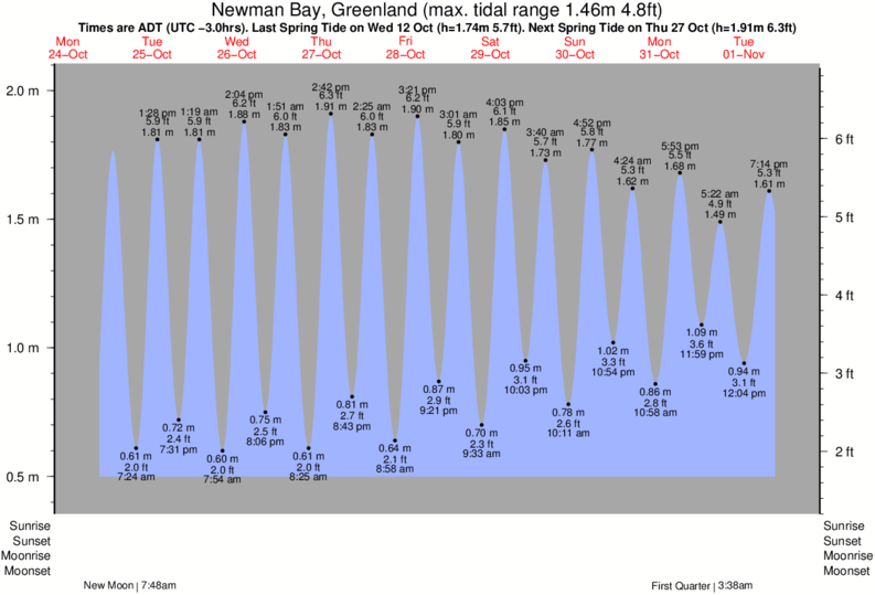 Newman Bay tide chart key: The tide chart above shows the height and times of high tide and low tide for Newman Bay, Greenland. The grey shading corresponds to nighttime hours between sunset and sunrise at Newman Bay.