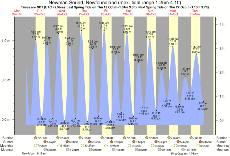 Newman Sound tide chart key: The tide chart above shows the height and times of high tide and low tide for Newman Sound, Newfoundland. The grey shading corresponds to nighttime hours between sunset and sunrise at Newman Sound.