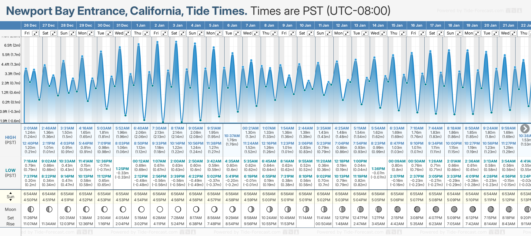 Tide chart for Newport BeachShowing low and high tide times for the next 30 days at Newport Beach. Tide Times are PST (UTC -8.0hrs).
