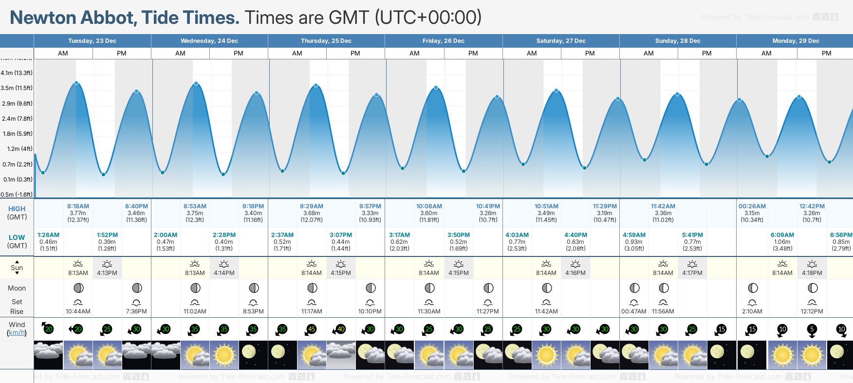 December and January Tide charts for Newton Abbot: The tide charts below show the height, time and date of high and low tides for the next 30 days.