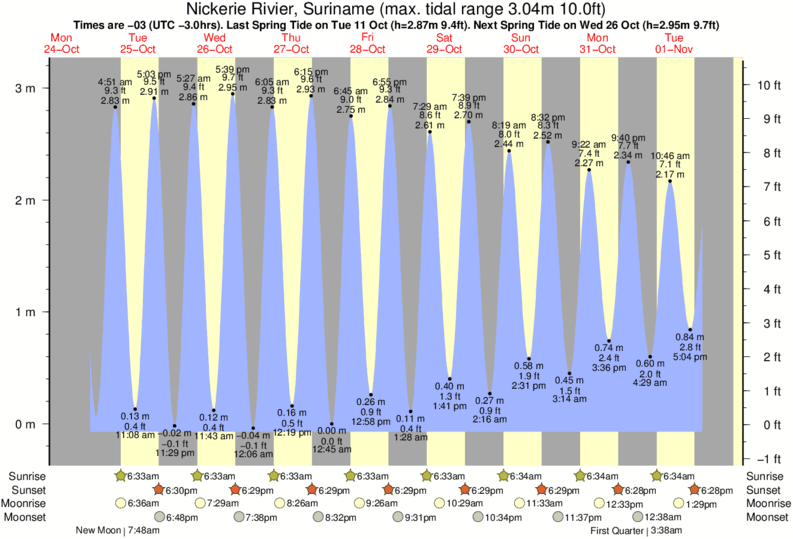 Tide Times are -03 (UTC -3.0hrs). Last Spring High Tide at Nickerie Rivier was on Fri 05 Dec (height: 2.90m 9.5ft). Next high Spring Tide at Nickerie Rivier will be on Mon 22 Dec (height: 2.63m 8.6ft).