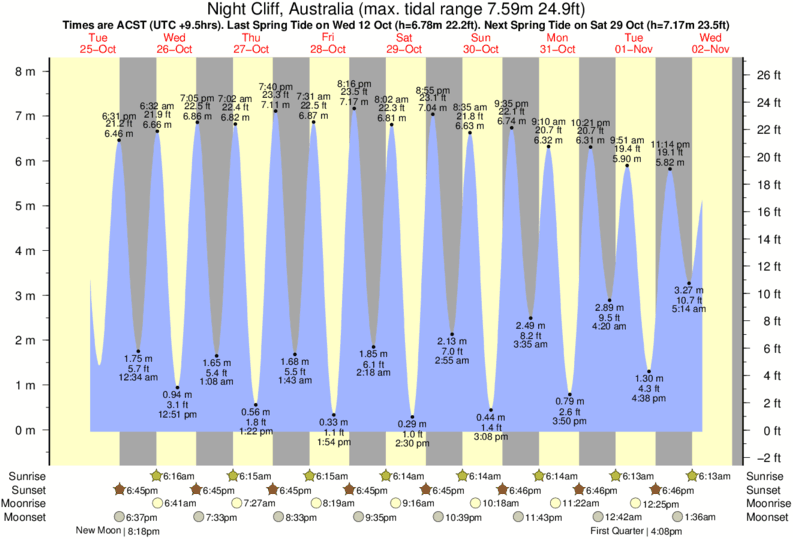 Tide Times are ACST (UTC +9.5hrs). Last Spring High Tide at Night Cliff was on Sun 07 Dec (height: 7.45m 24.4ft). Next high Spring Tide at Night Cliff will be on Tue 23 Dec (height: 7.05m 23.1ft).