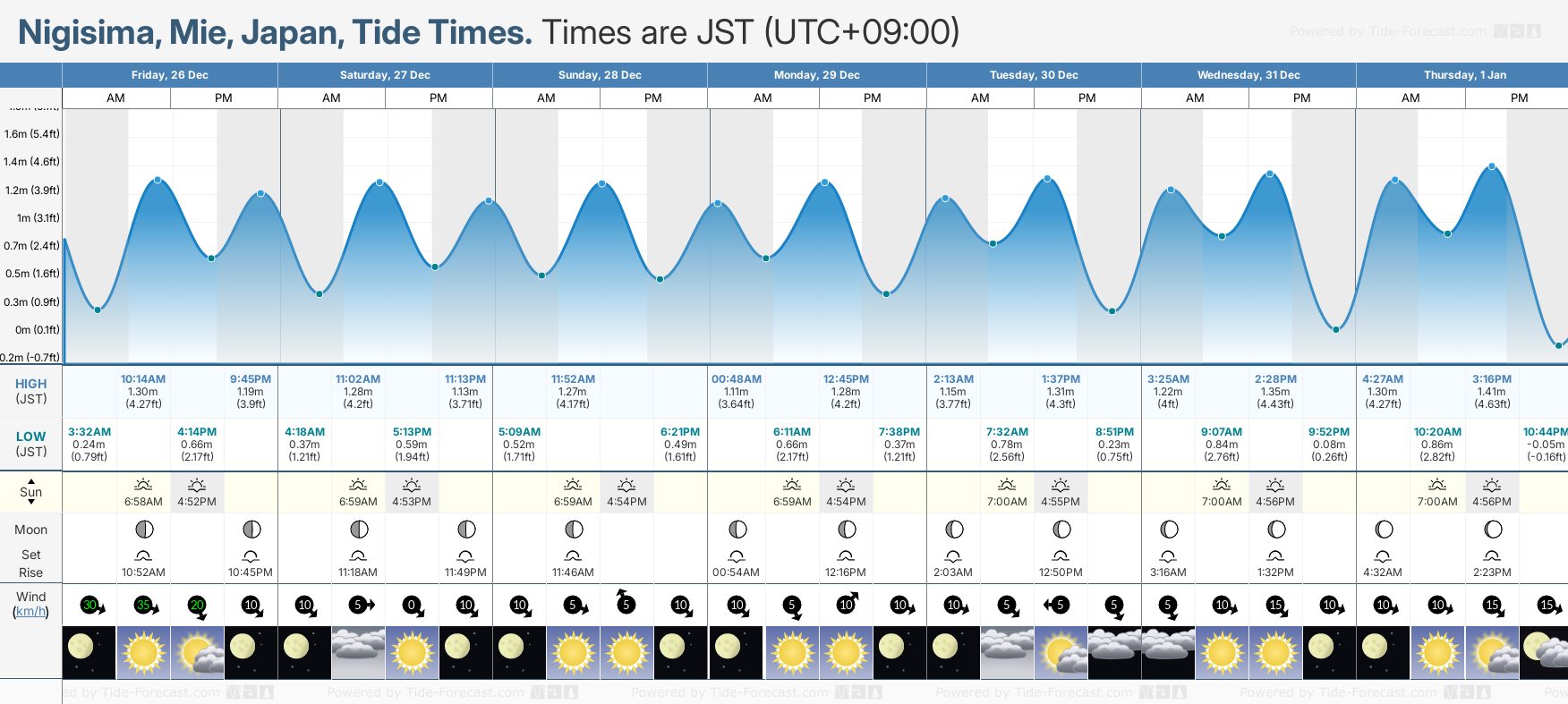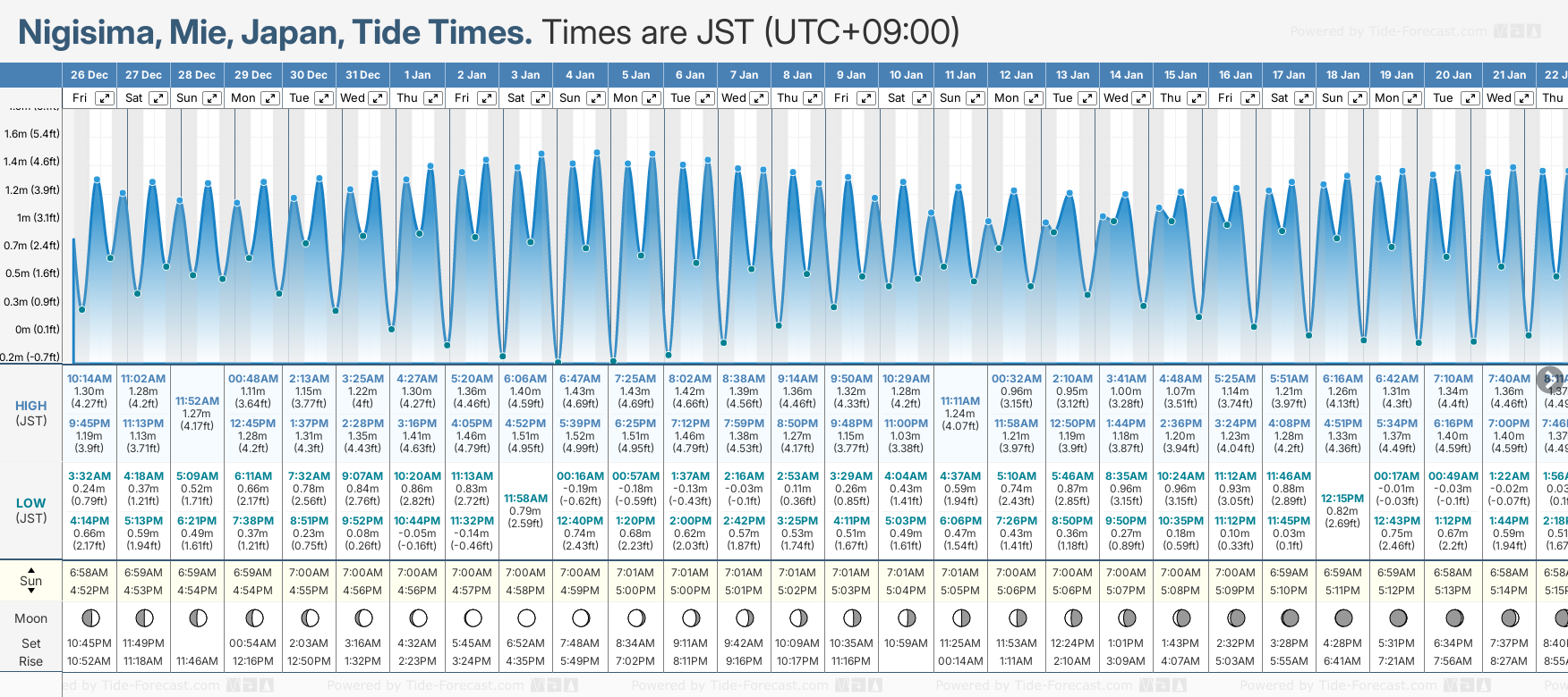 December and January Tide charts for Nigisima: The tide charts below show the height, time and date of high and low tides for the next 30 days.