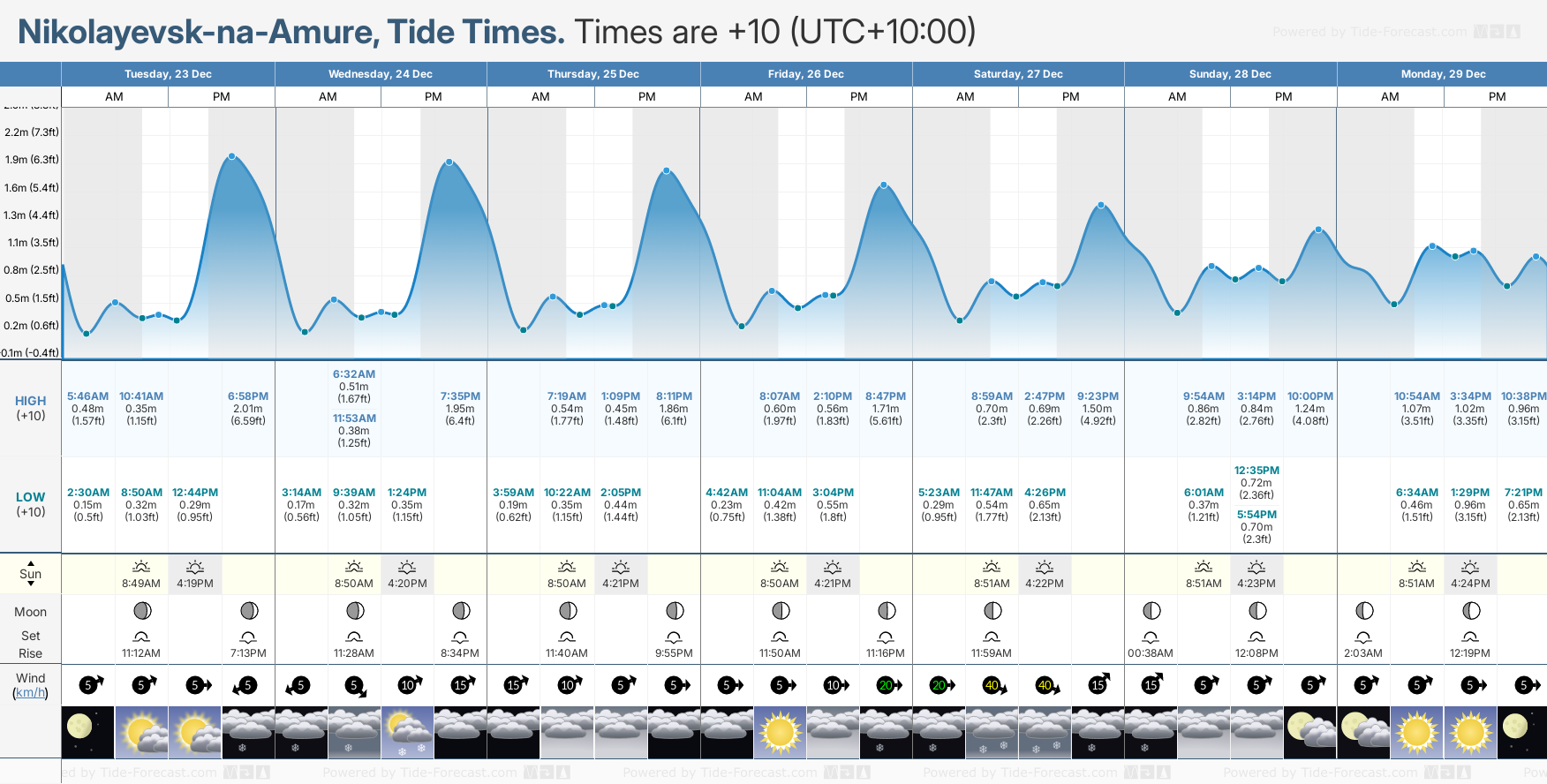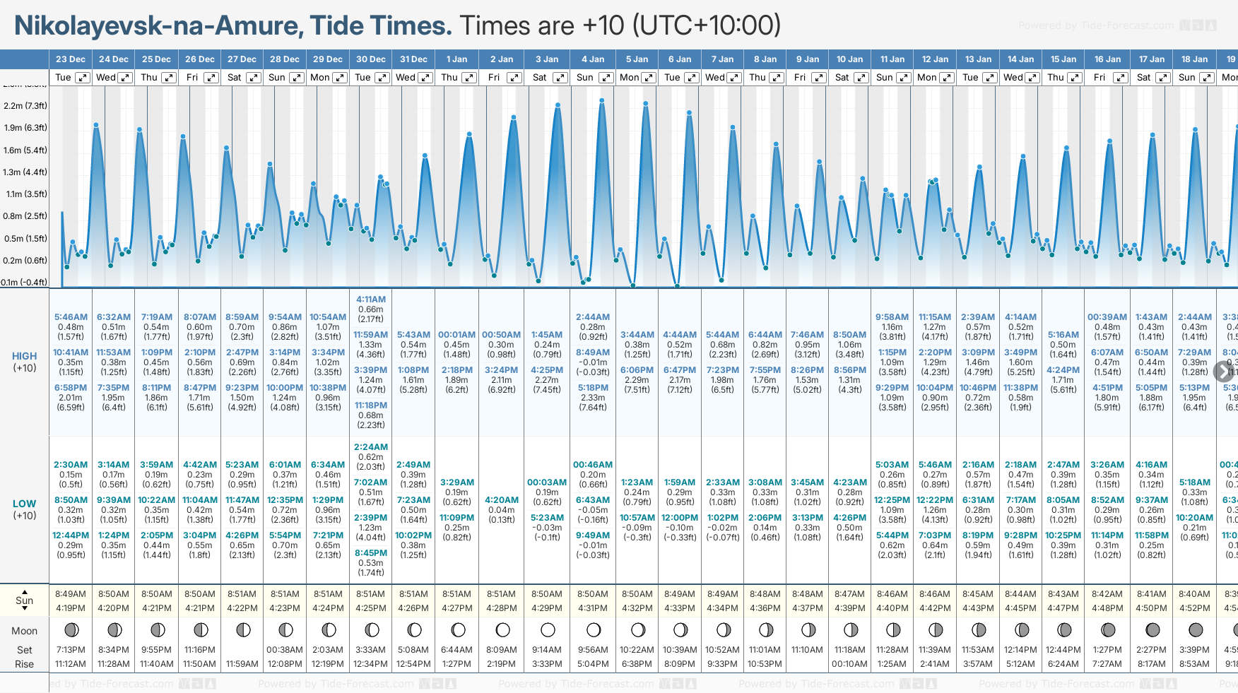 December and January Tide charts for Nikolayevsk-na-Amure: The tide charts below show the height, time and date of high and low tides for the next 30 days.