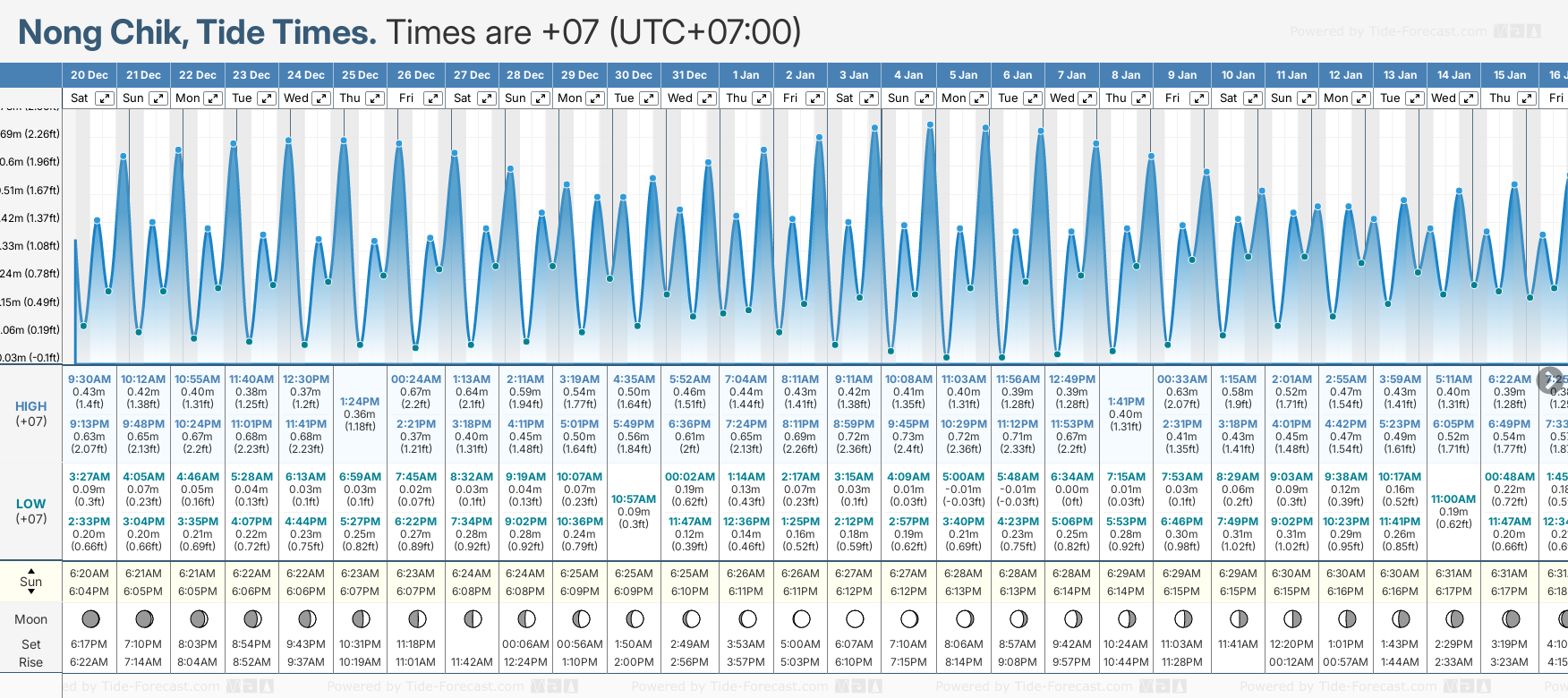 Tide Times are +07 (UTC +7.0hrs). Last Spring High Tide at Nong Chik was on Sun 07 Dec (height: 0.73m 2.4ft). Next high Spring Tide at Nong Chik will be on Wed 24 Dec (height: 0.68m 2.2ft).