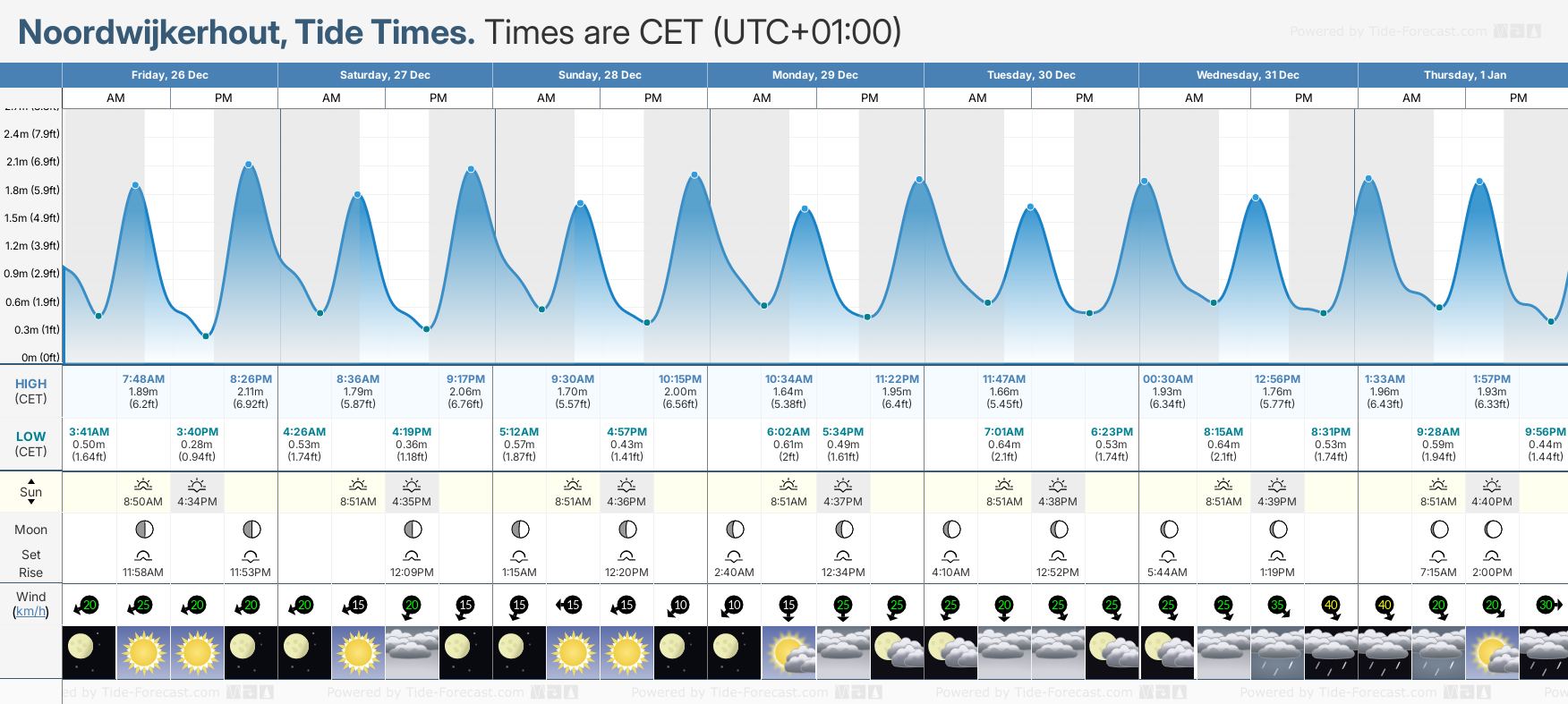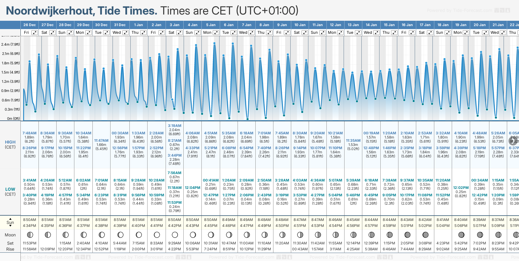 December and January Tide charts for Noordwijkerhout: The tide charts below show the height, time and date of high and low tides for the next 30 days.