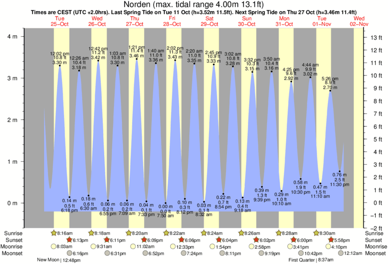 Tide Times are CET (UTC +1.0hrs). Last Spring High Tide at Norden was on Mon 08 Dec (height: 3.66m 12.0ft). Next high Spring Tide at Norden will be on Thu 25 Dec (height: 3.32m 10.9ft).