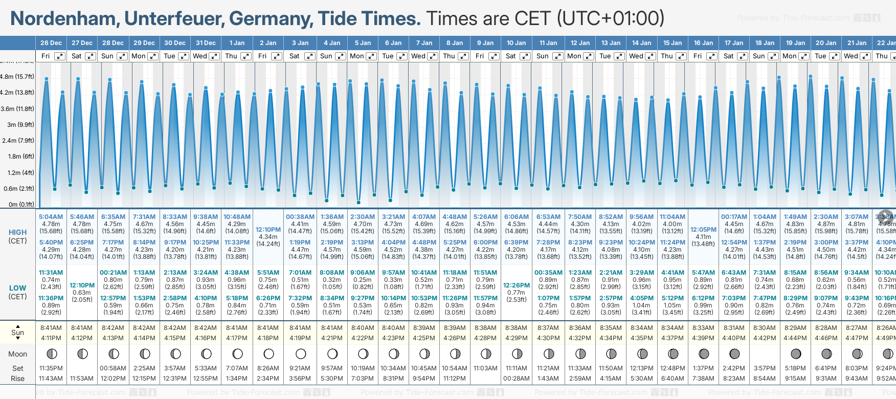Tide Times are CET (UTC +1.0hrs). Last Spring High Tide at Nordenham, Unterfeuer was on Mon 22 Dec (height: 4.96m 16.3ft). Next high Spring Tide at Nordenham, Unterfeuer will be on Tue 06 Jan (height: 4.73m 15.5ft).
