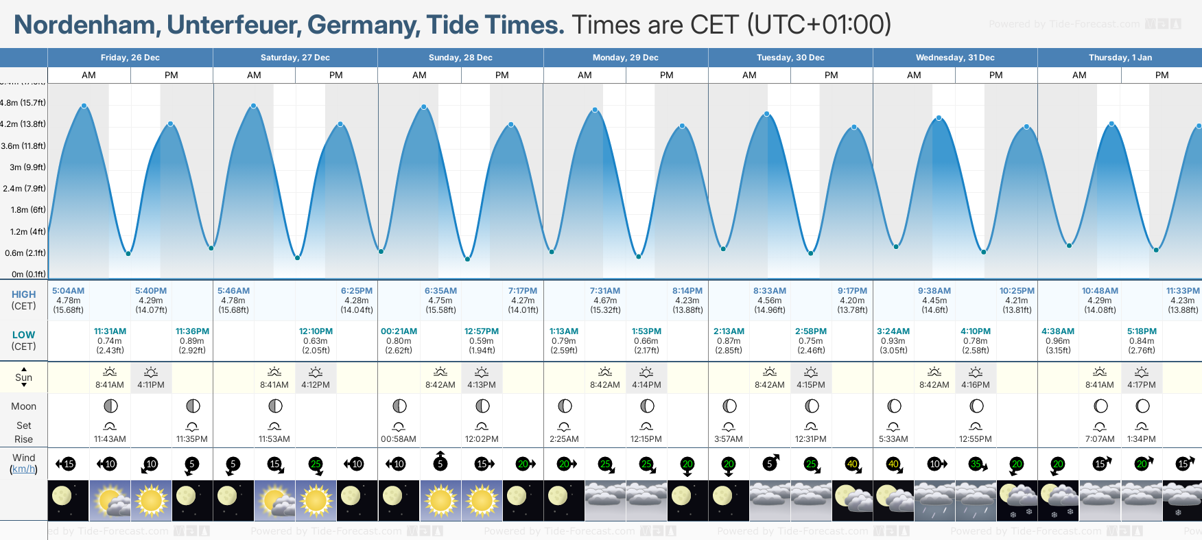 December and January Tide charts for Nordenham, Unterfeuer: The tide charts below show the height, time and date of high and low tides for the next 30 days.