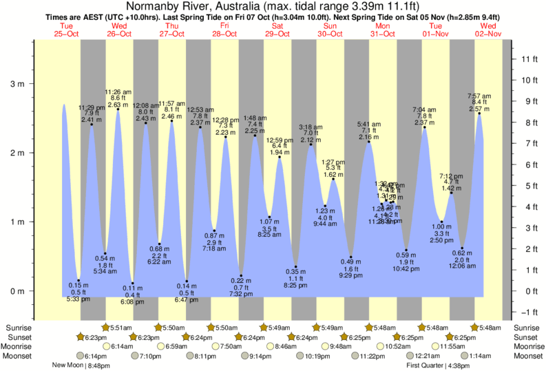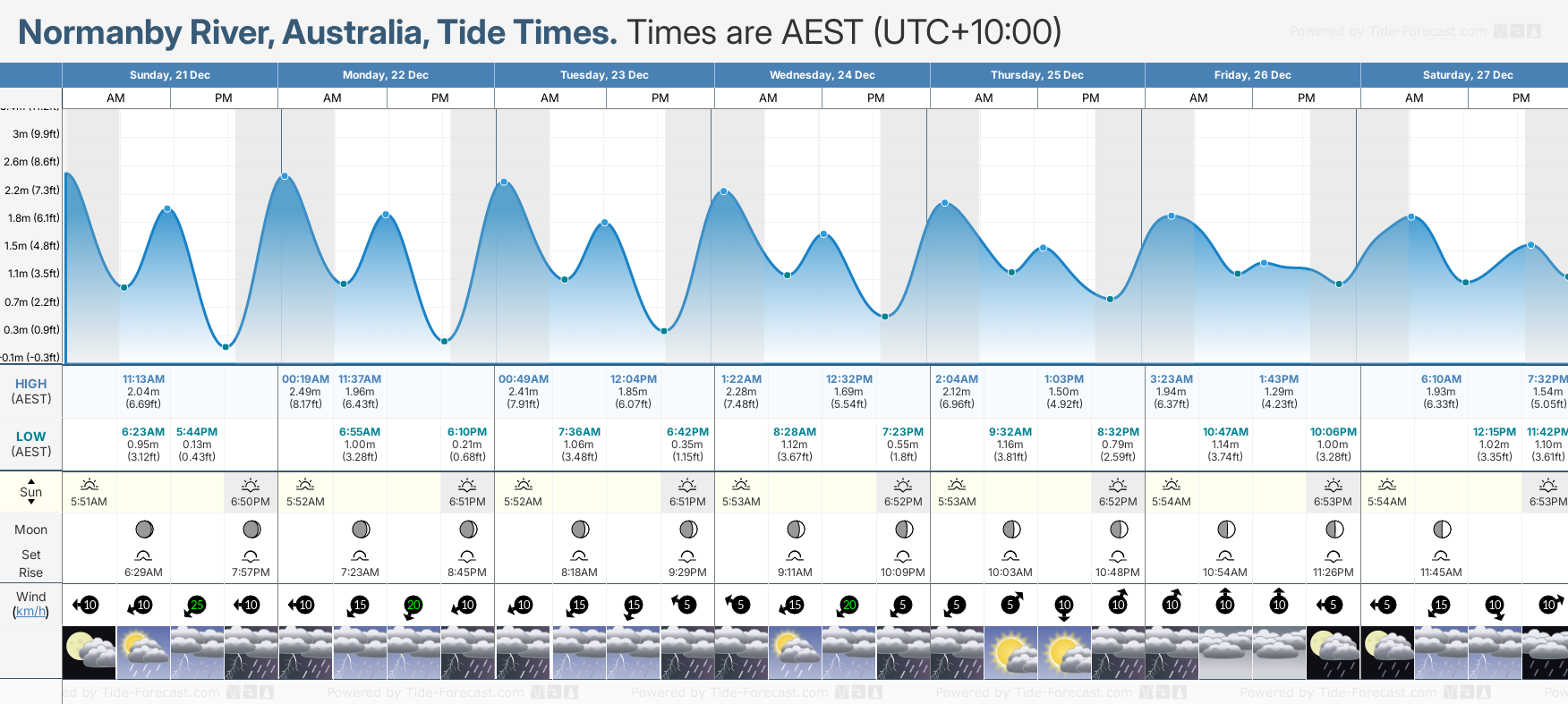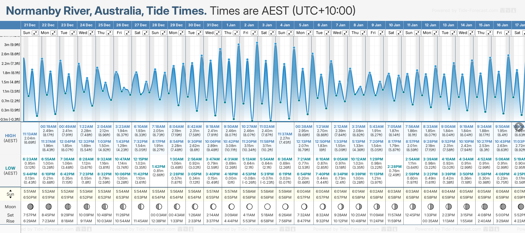 December and January Tide charts for Normanby River: The tide charts below show the height, time and date of high and low tides for the next 30 days.