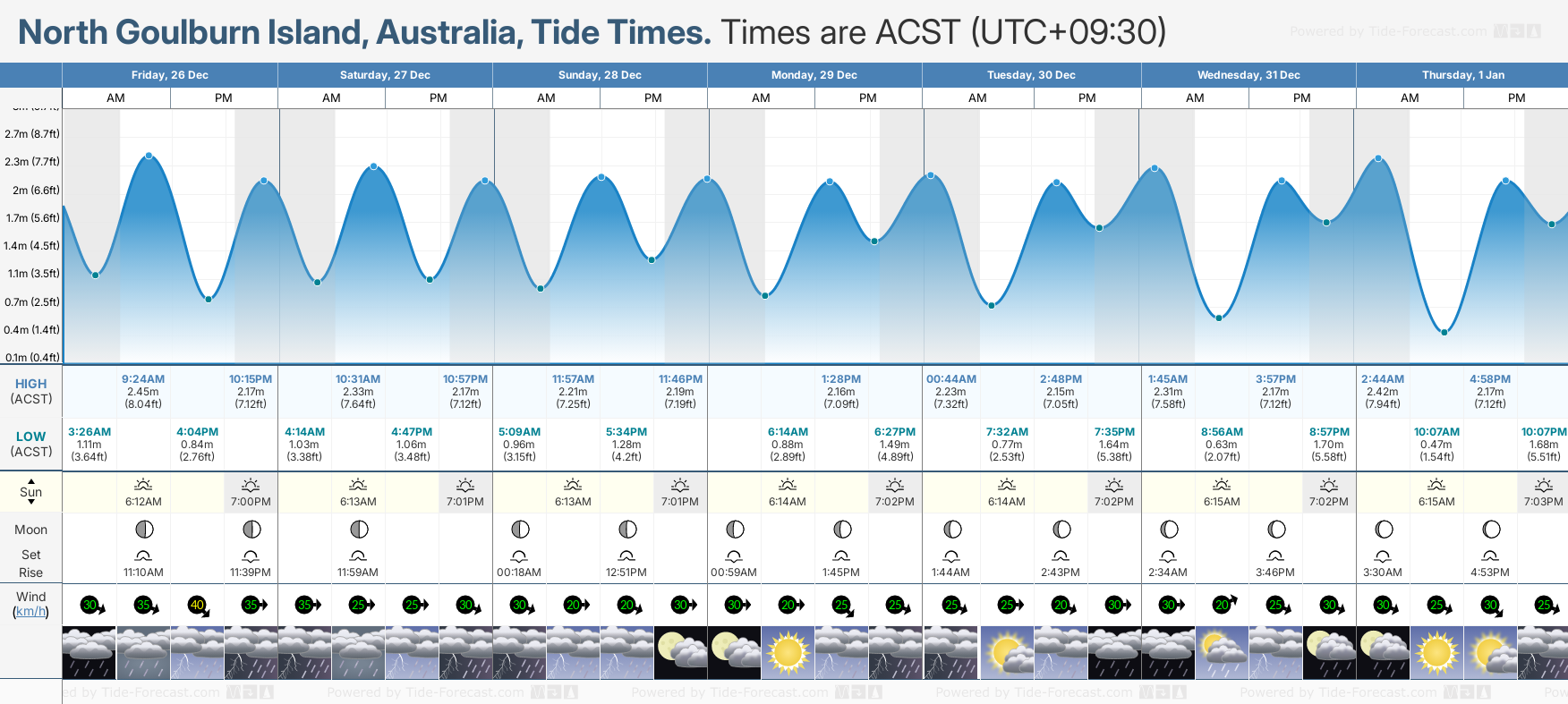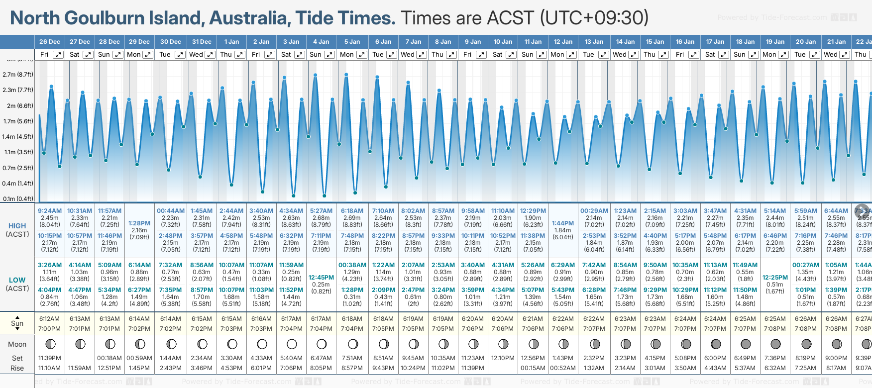 December and January Tide charts for North Goulburn Island: The tide charts below show the height, time and date of high and low tides for the next 30 days.