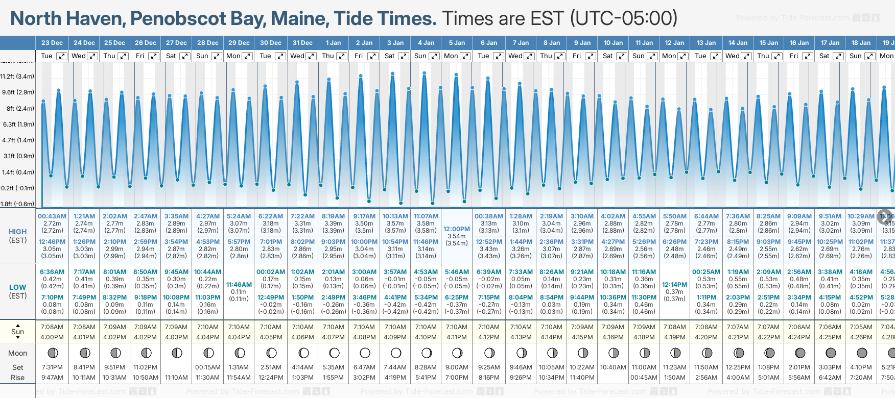 December and January Tide charts for North Haven, Penobscot Bay: The tide charts below show the height, time and date of high and low tides for the next 30 days.