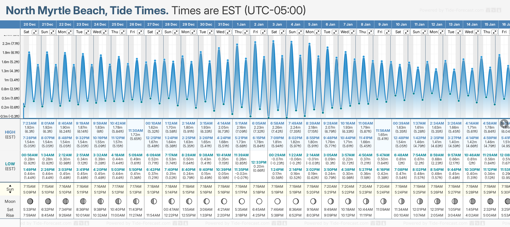 Tide Times are EST (UTC -5.0hrs). Last Spring High Tide at North Myrtle Beach was on Fri 05 Dec (height: 2.31m 7.6ft). Next high Spring Tide at North Myrtle Beach will be on Sun 21 Dec (height: 1.92m 6.3ft).