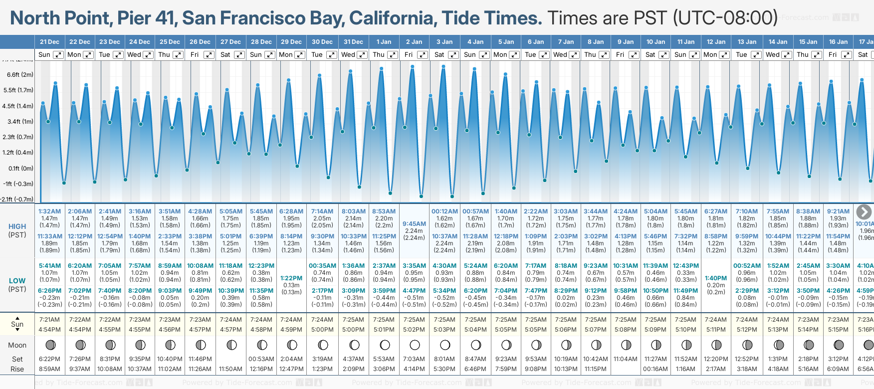 December and January Tide charts for North Point, Pier 41, San Francisco Bay: The tide charts below show the height, time and date of high and low tides for the next 30 days.