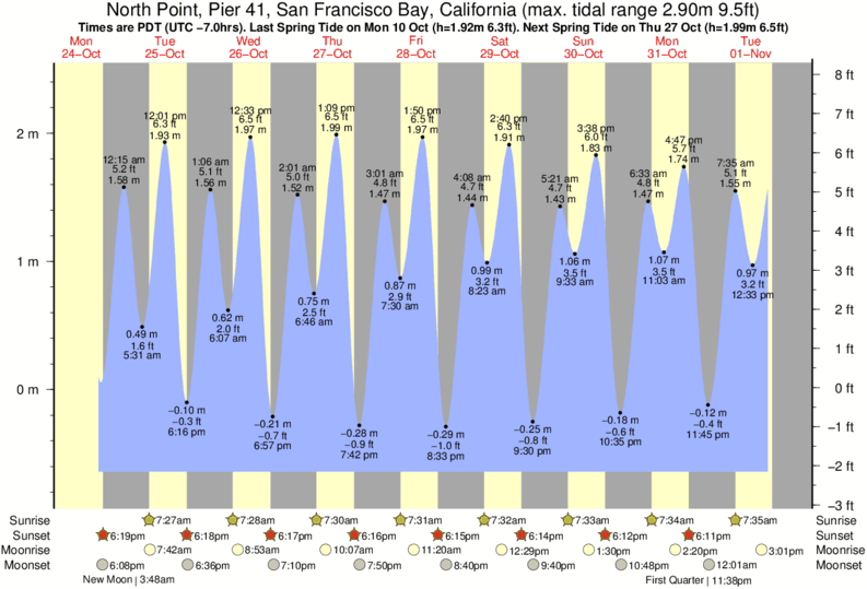 Tide chart for North Point, Pier 41, San Francisco BayShowing low and high tide times for the next 30 days at North Point, Pier 41, San Francisco Bay. Tide Times are PST (UTC -8.0hrs).