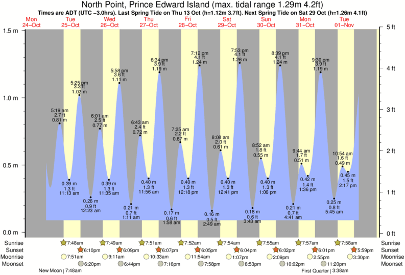 North Point tide chart key: The tide chart above shows the height and times of high tide and low tide for North Point, Prince Edward Island. The grey shading corresponds to nighttime hours between sunset and sunrise at North Point.