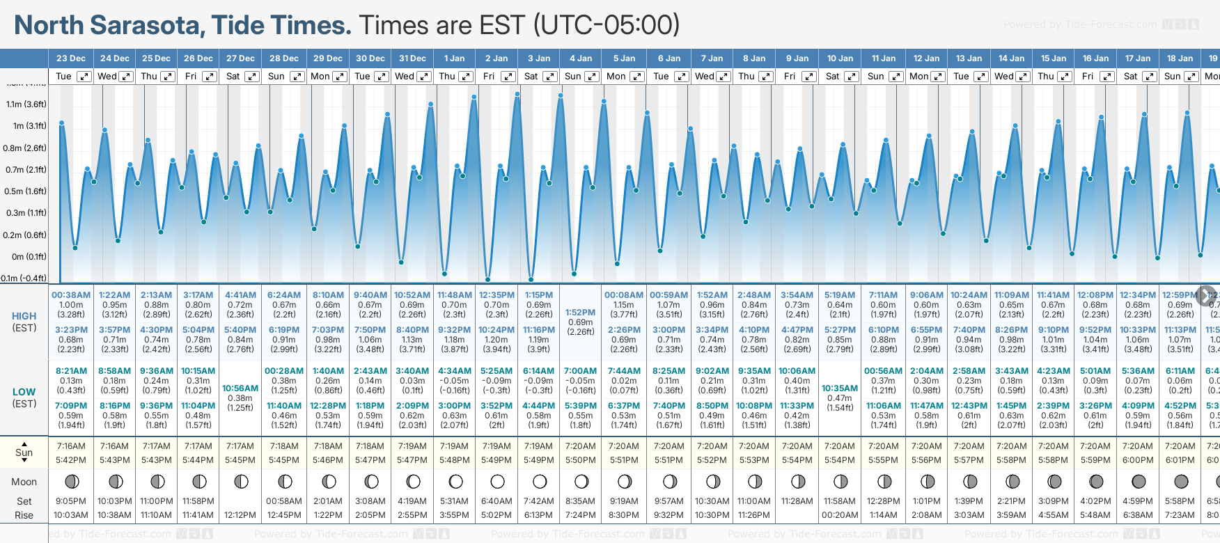 December and January Tide charts for North Sarasota: The tide charts below show the height, time and date of high and low tides for the next 30 days.