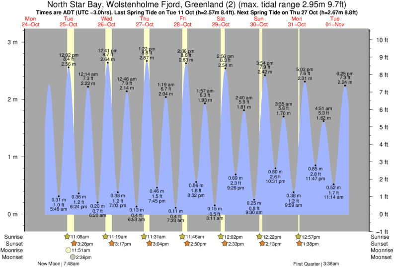 Tide Times are AST (UTC -4.0hrs). Last Spring High Tide at North Star Bay, Wolstenholme Fjord (2) was on Sat 06 Dec (height: 2.95m 9.7ft). Next high Spring Tide at North Star Bay, Wolstenholme Fjord (2) will be on Sun 04 Jan (height: 2.94m 9.6ft).