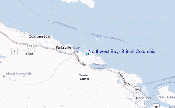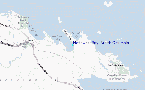 Use this relief map to navigate to tide stations, surf breaks and cities that are in the area of Northwest Bay, British Columbia.