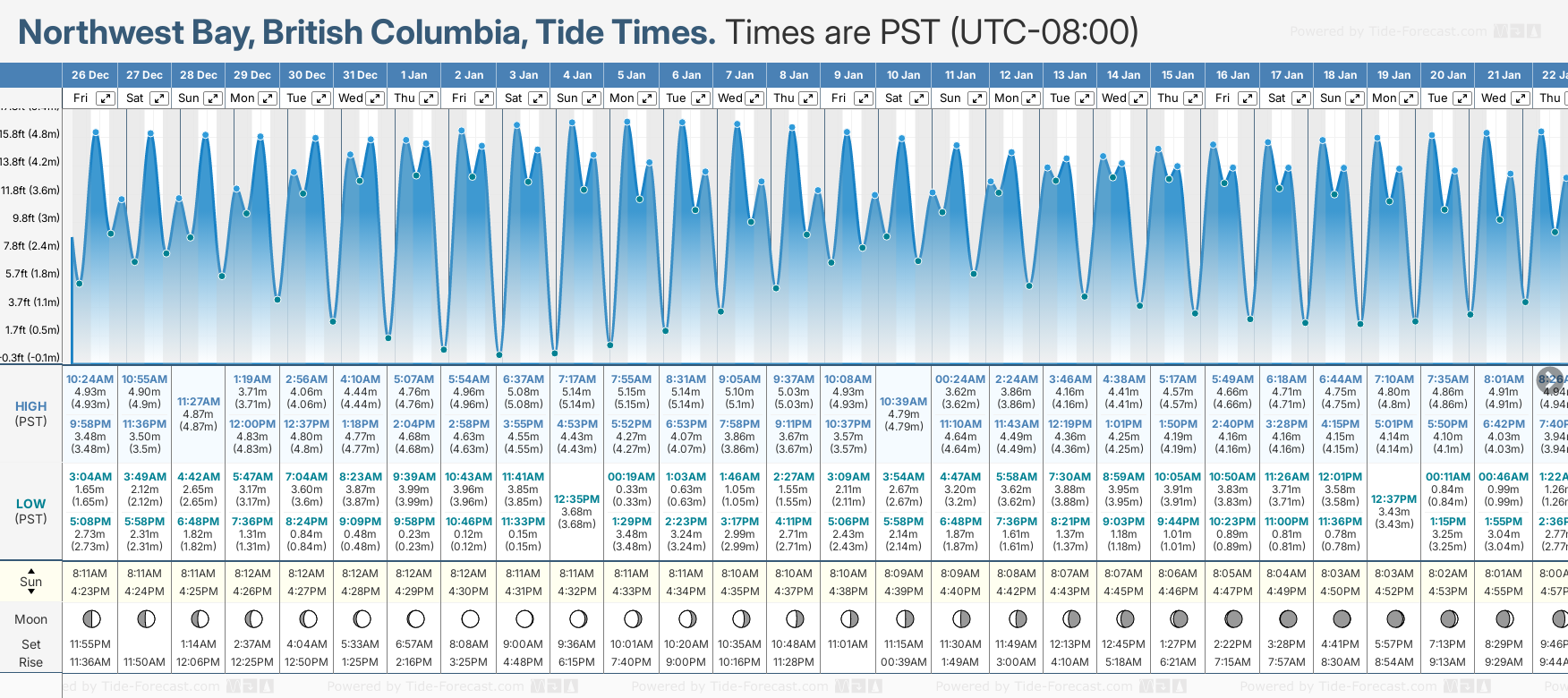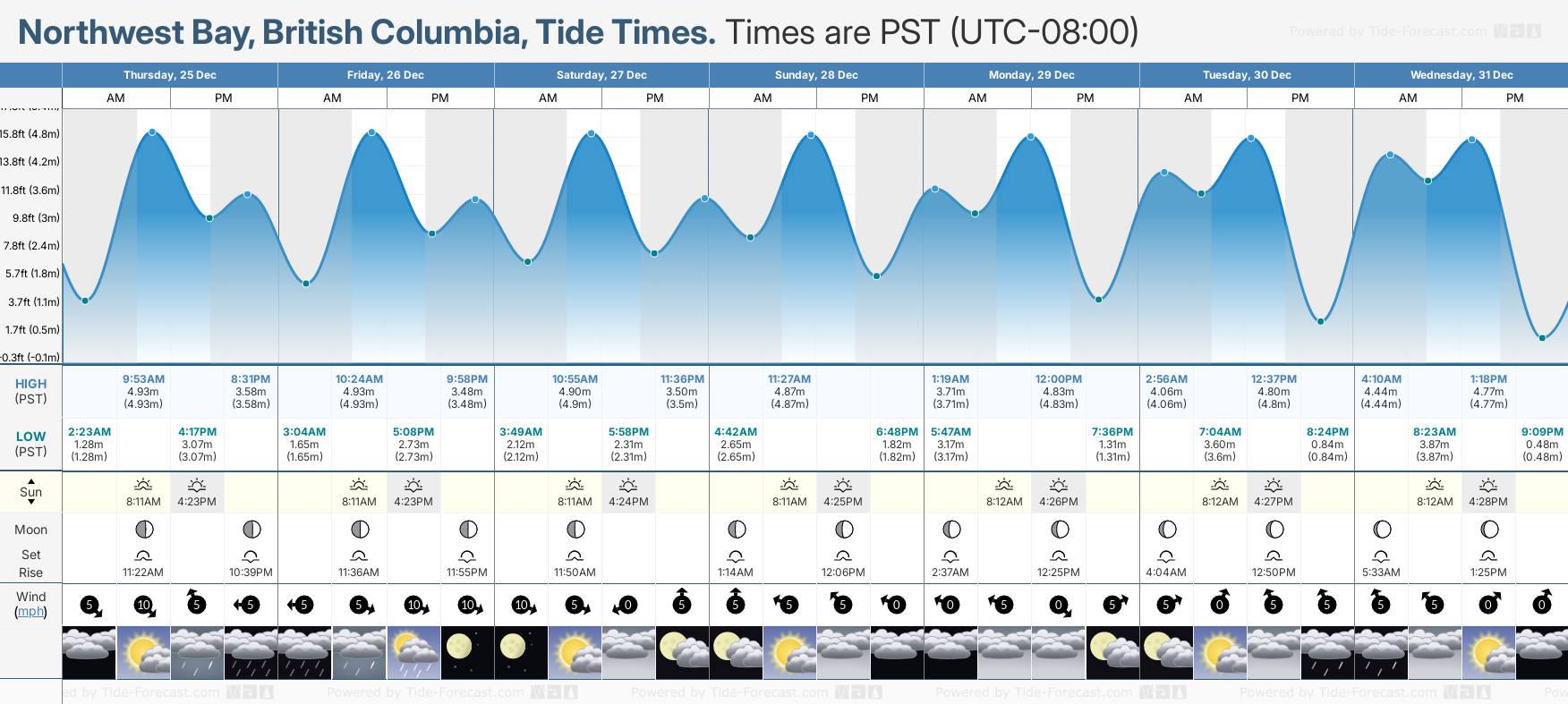 Tide Times are PST (UTC -8.0hrs). Last Spring High Tide at Northwest Bay was on Sun 07 Dec (height: 5.12m 16.8ft). Next high Spring Tide at Northwest Bay will be on Fri 26 Dec (height: 4.93m 16.2ft).