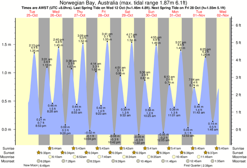 Tide Times are AWST (UTC +8.0hrs). Last Spring High Tide at Norwegian Bay was on Sat 06 Dec (height: 1.79m 5.9ft). Next high Spring Tide at Norwegian Bay will be on Sun 21 Dec (height: 1.55m 5.1ft).
