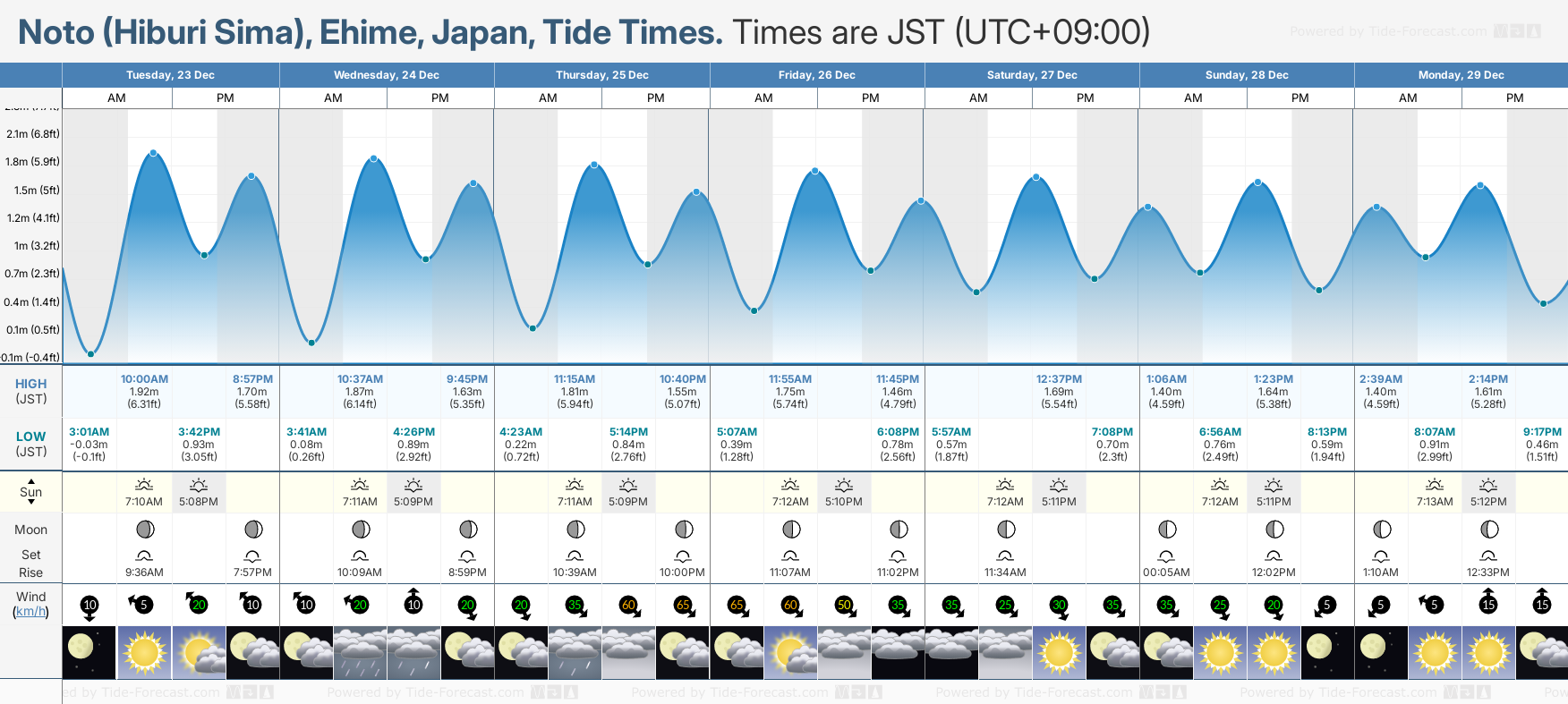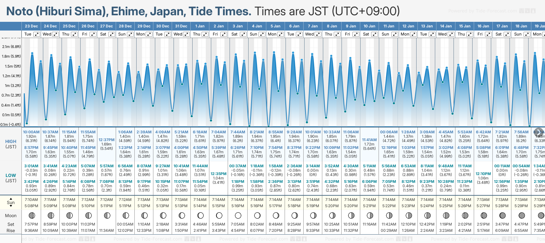 Tide chart for Noto (Hiburi Sima)Showing low and high tide times for the next 30 days at Noto (Hiburi Sima). Tide Times are JST (UTC +9.0hrs).