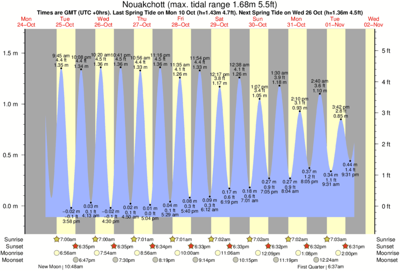Tide chart for NouakchottShowing low and high tide times for the next 30 days at Nouakchott. Tide Times are GMT (UTC +0hrs).
