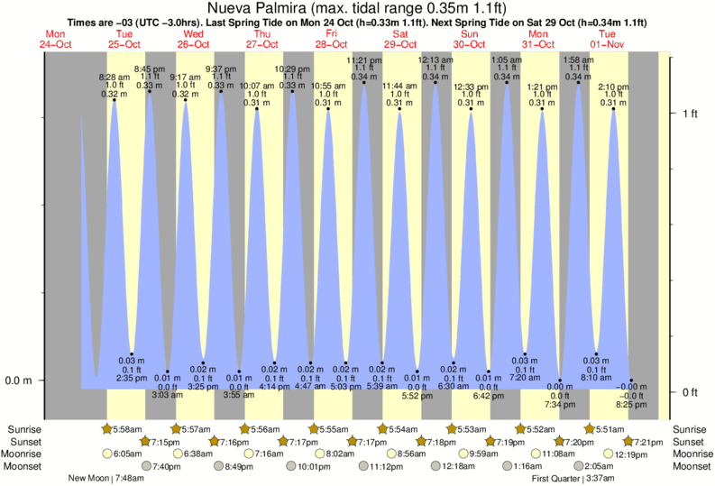 Tide chart for Nueva PalmiraShowing low and high tide times for the next 30 days at Nueva Palmira. Tide Times are -03 (UTC -3.0hrs).