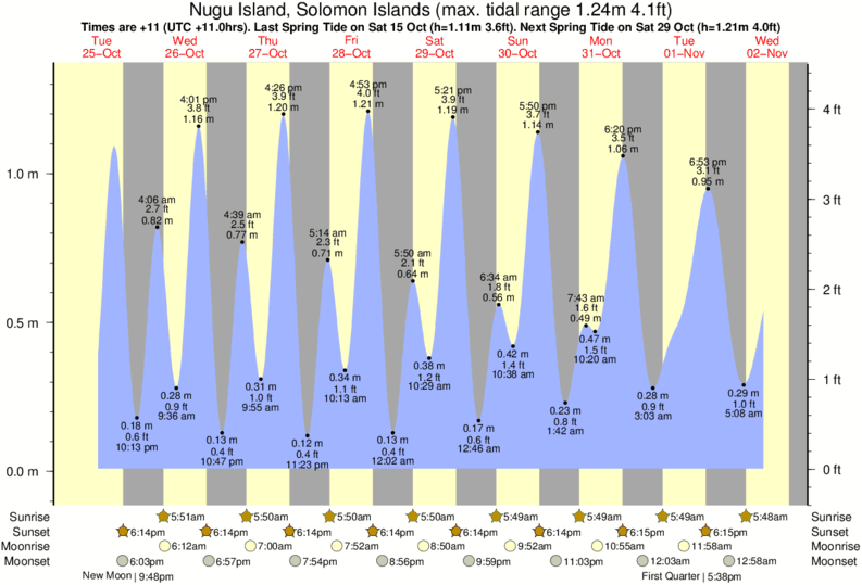 Nugu Island tide chart key: The tide chart above shows the height and times of high tide and low tide for Nugu Island, Solomon Islands. The grey shading corresponds to nighttime hours between sunset and sunrise at Nugu Island.