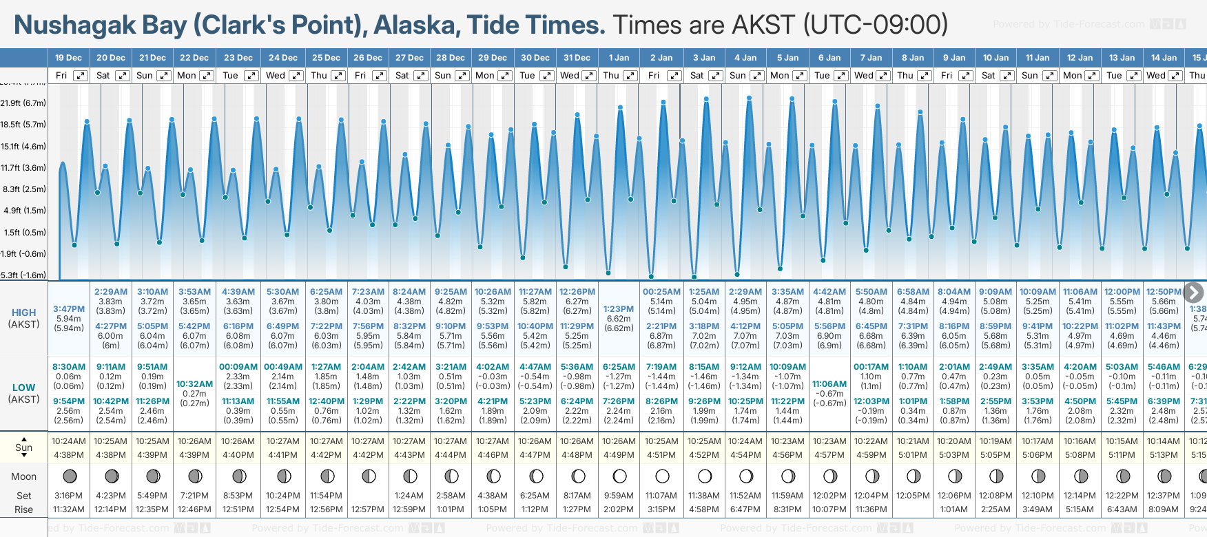 December and January Tide charts for Nushagak Bay (Clark's Point): The tide charts below show the height, time and date of high and low tides for the next 30 days.