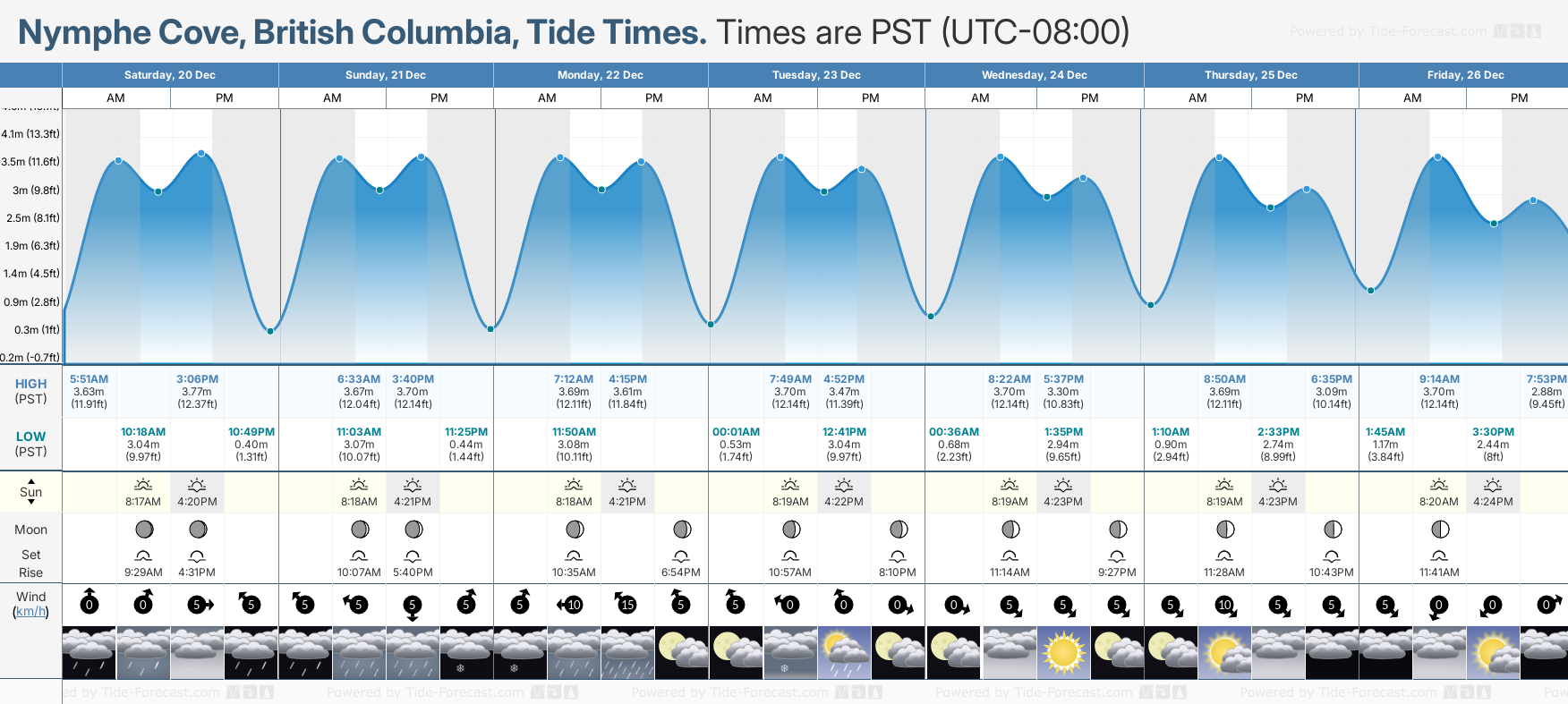 Tide Times are PST (UTC -8.0hrs). Last Spring High Tide at Nymphe Cove was on Sun 14 Dec (height: 3.94m 12.9ft). Next high Spring Tide at Nymphe Cove will be on Mon 22 Dec (height: 3.70m 12.1ft).