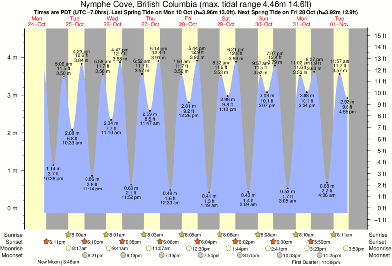 Tide chart for Nymphe CoveShowing low and high tide times for the next 30 days at Nymphe Cove. Tide Times are PST (UTC -8.0hrs).