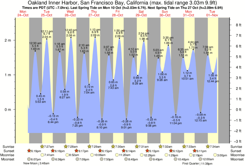 Tide chart for Oakland Inner Harbor, San Francisco BayShowing low and high tide times for the next 30 days at Oakland Inner Harbor, San Francisco Bay. Tide Times are PST (UTC -8.0hrs).