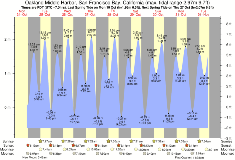 Tide chart for Oakland Middle Harbor, San Francisco BayShowing low and high tide times for the next 30 days at Oakland Middle Harbor, San Francisco Bay. Tide Times are PST (UTC -8.0hrs).