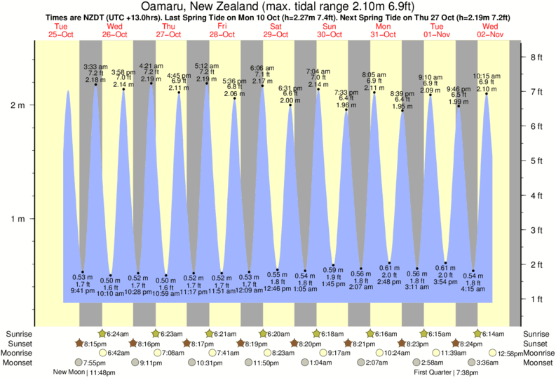 Tide Times are NZDT (UTC +13.0hrs). Last Spring High Tide at Oamaru was on Sat 06 Dec (height: 2.32m 7.6ft). Next high Spring Tide at Oamaru will be on Tue 23 Dec (height: 2.01m 6.6ft).
