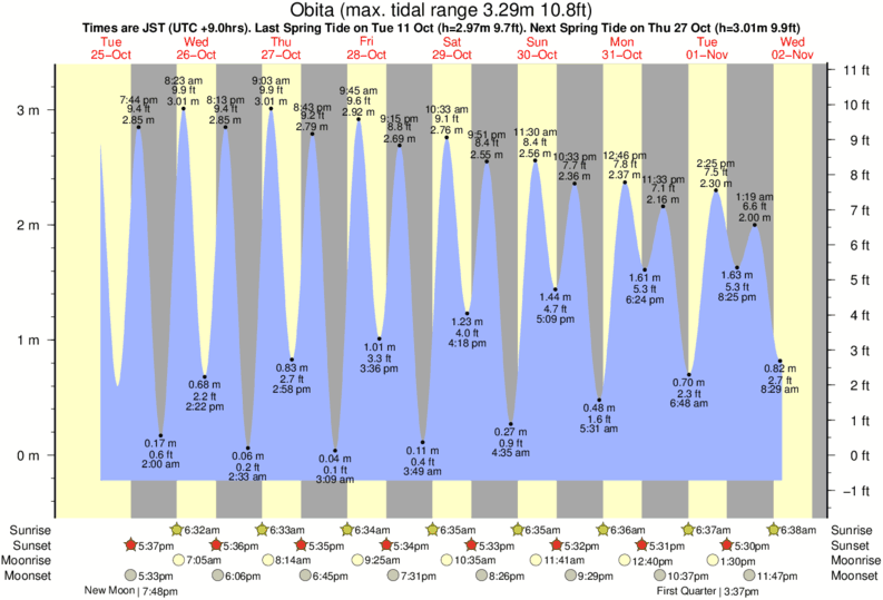 Tide Times are JST (UTC +9.0hrs). Last Spring High Tide at Obita was on Fri 05 Dec (height: 3.02m 9.9ft). Next high Spring Tide at Obita will be on Sun 04 Jan (height: 2.95m 9.7ft).