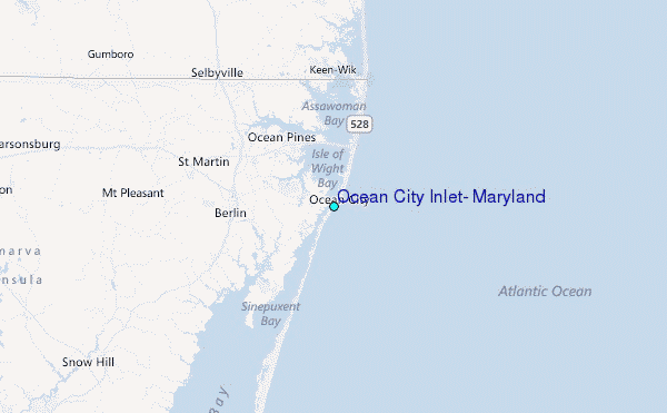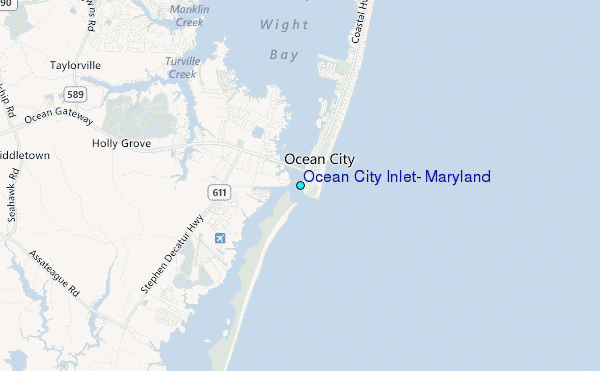 Use this relief map to navigate to tide stations, surf breaks and cities that are in the area of Ocean City Inlet, Maryland.