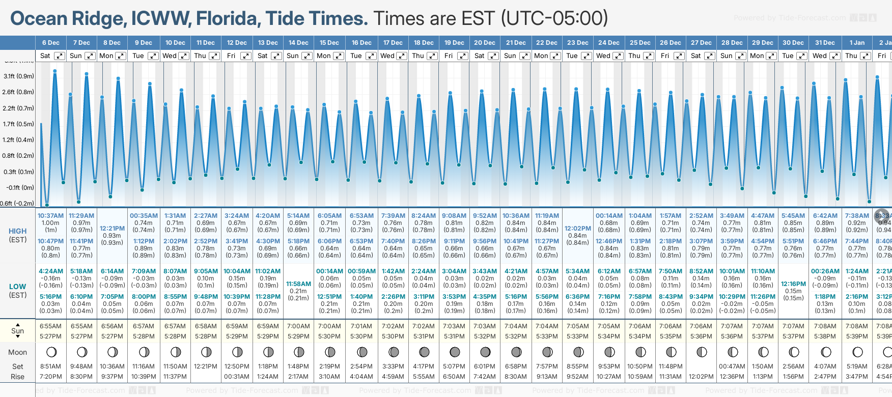 Tide Times are EST (UTC -5.0hrs). Last Spring High Tide at Ocean Ridge, ICWW was on Sat 06 Dec (height: 1.00m 3.3ft). Next high Spring Tide at Ocean Ridge, ICWW will be on Sun 21 Dec (height: 0.84m 2.8ft).