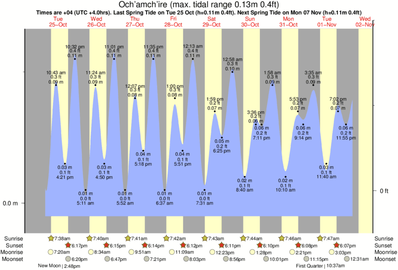 Tide Times are +04 (UTC +4.0hrs). Last Spring High Tide at Och'amch'ire was on Fri 19 Dec (height: 0.11m 0.4ft). Next high Spring Tide at Och'amch'ire will be on Fri 02 Jan (height: 0.12m 0.4ft).