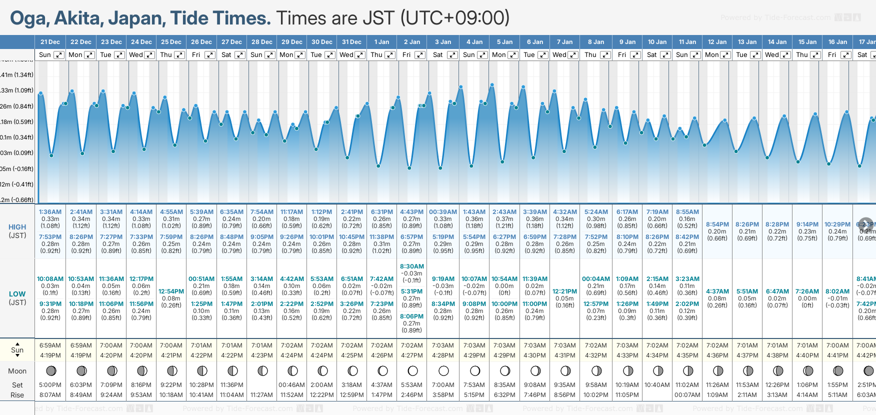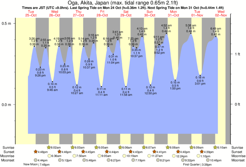 Tide Times are JST (UTC +9.0hrs). Last Spring High Tide at Oga was on Mon 08 Dec (height: 0.43m 1.4ft). Next high Spring Tide at Oga will be on Mon 22 Dec (height: 0.34m 1.1ft).