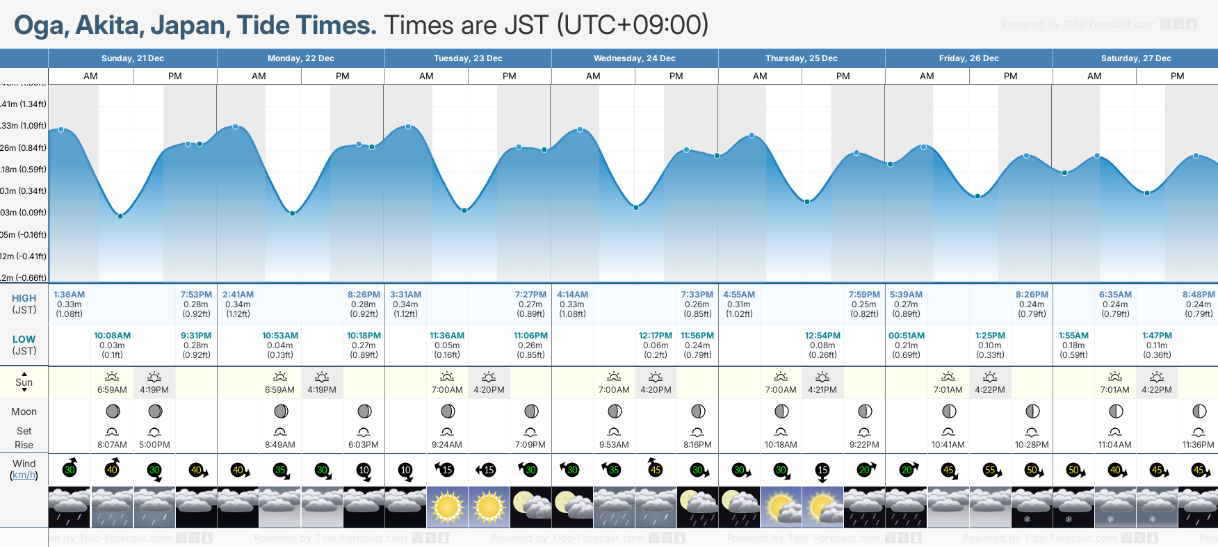 NOTE: Use of this site for Oga, Akita, Japan tide times is subject to our terms.