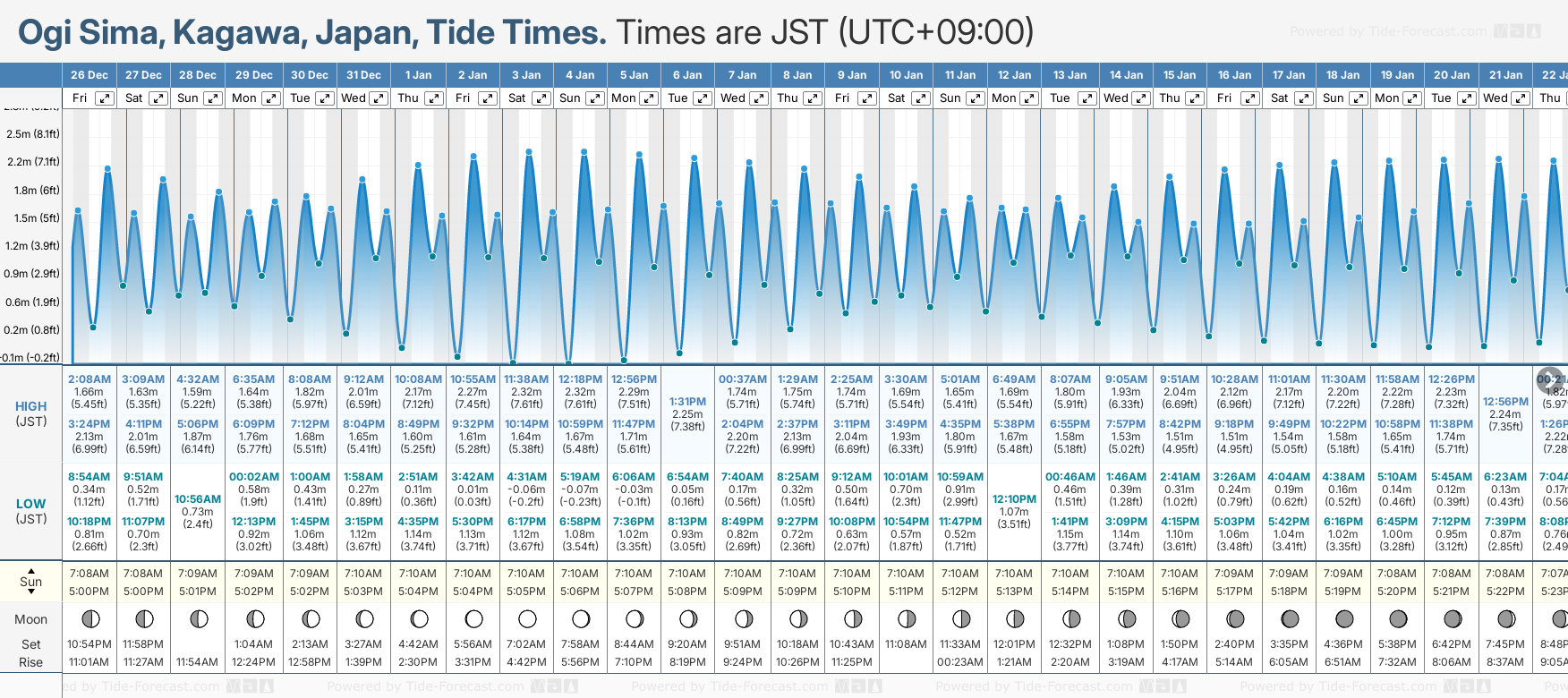Tide Times are JST (UTC +9.0hrs). Last Spring High Tide at Ogi Sima was on Tue 23 Dec (height: 2.27m 7.4ft). Next high Spring Tide at Ogi Sima will be on Sat 03 Jan (height: 2.32m 7.6ft).