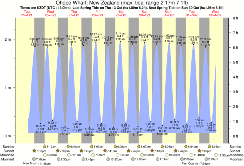 Tide chart for Ohope WharfShowing low and high tide times for the next 30 days at Ohope Wharf. Tide Times are NZDT (UTC +13.0hrs).