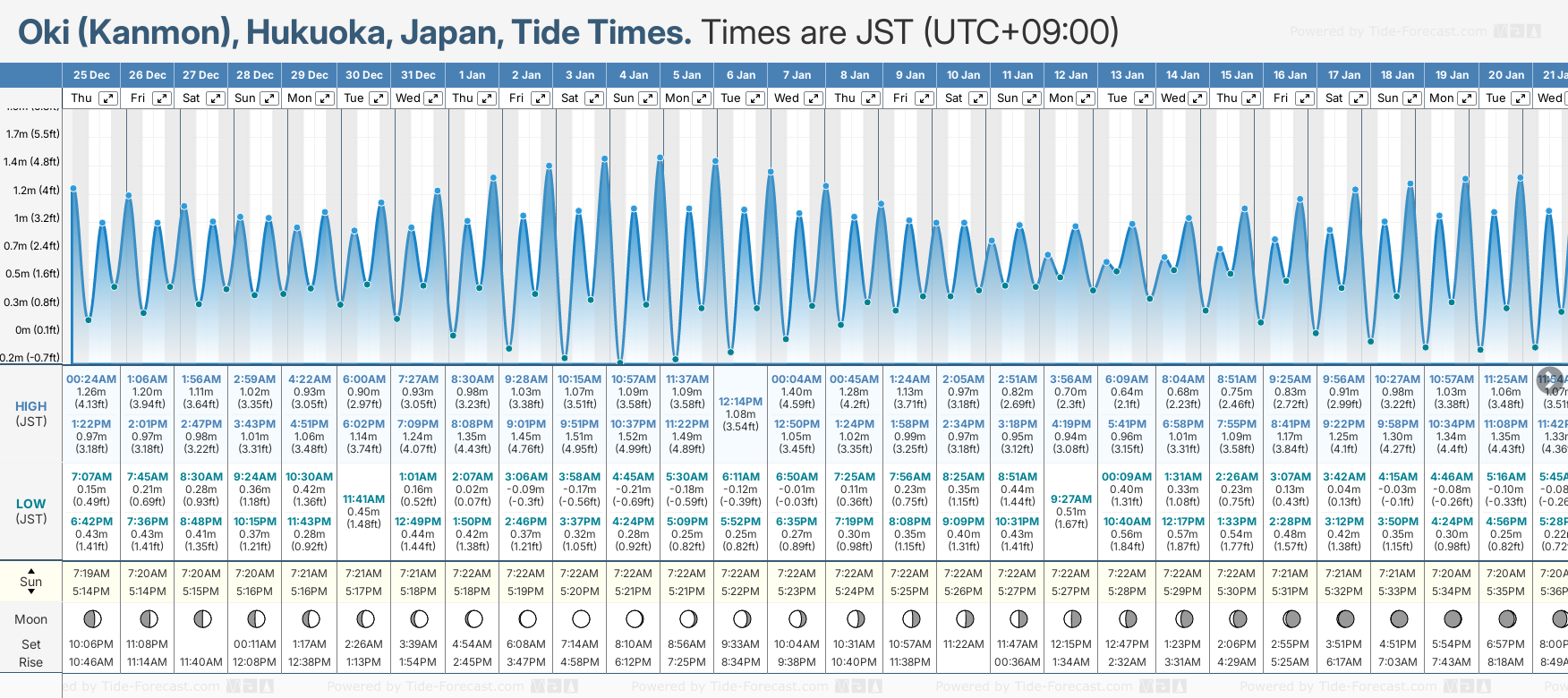 Tide Times are JST (UTC +9.0hrs). Last Spring High Tide at Oki (Kanmon) was on Mon 22 Dec (height: 1.36m 4.5ft). Next high Spring Tide at Oki (Kanmon) will be on Mon 05 Jan (height: 1.52m 5.0ft).
