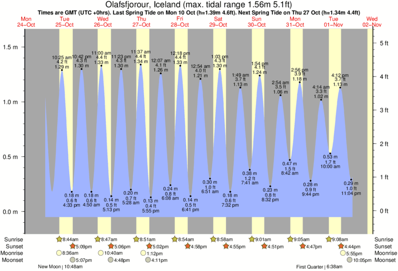 Tide Times are GMT (UTC +0hrs). Last Spring High Tide at Olafsfjorour was on Sat 06 Dec (height: 1.44m 4.7ft). Next high Spring Tide at Olafsfjorour will be on Mon 22 Dec (height: 1.31m 4.3ft).