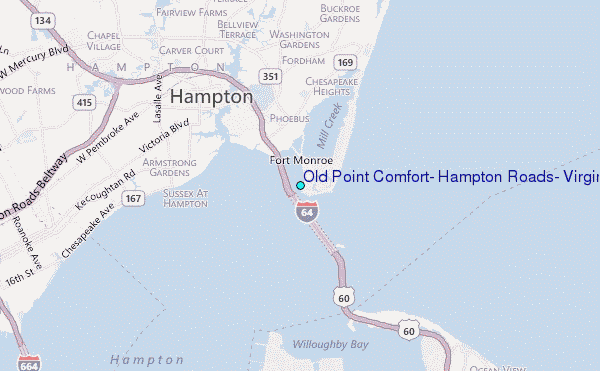 Use this relief map to navigate to tide stations, surf breaks and cities that are in the area of Old Point Comfort, Hampton Roads, Virginia.