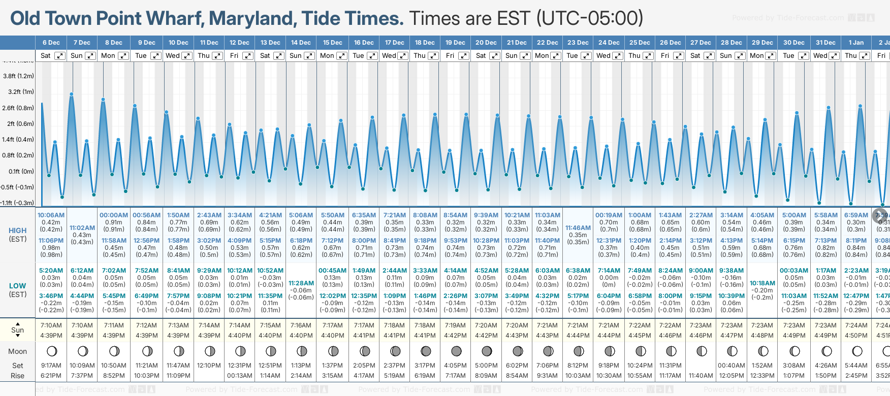 Tide chart for Old Town Point WharfShowing low and high tide times for the next 30 days at Old Town Point Wharf. Tide Times are EST (UTC -5.0hrs).